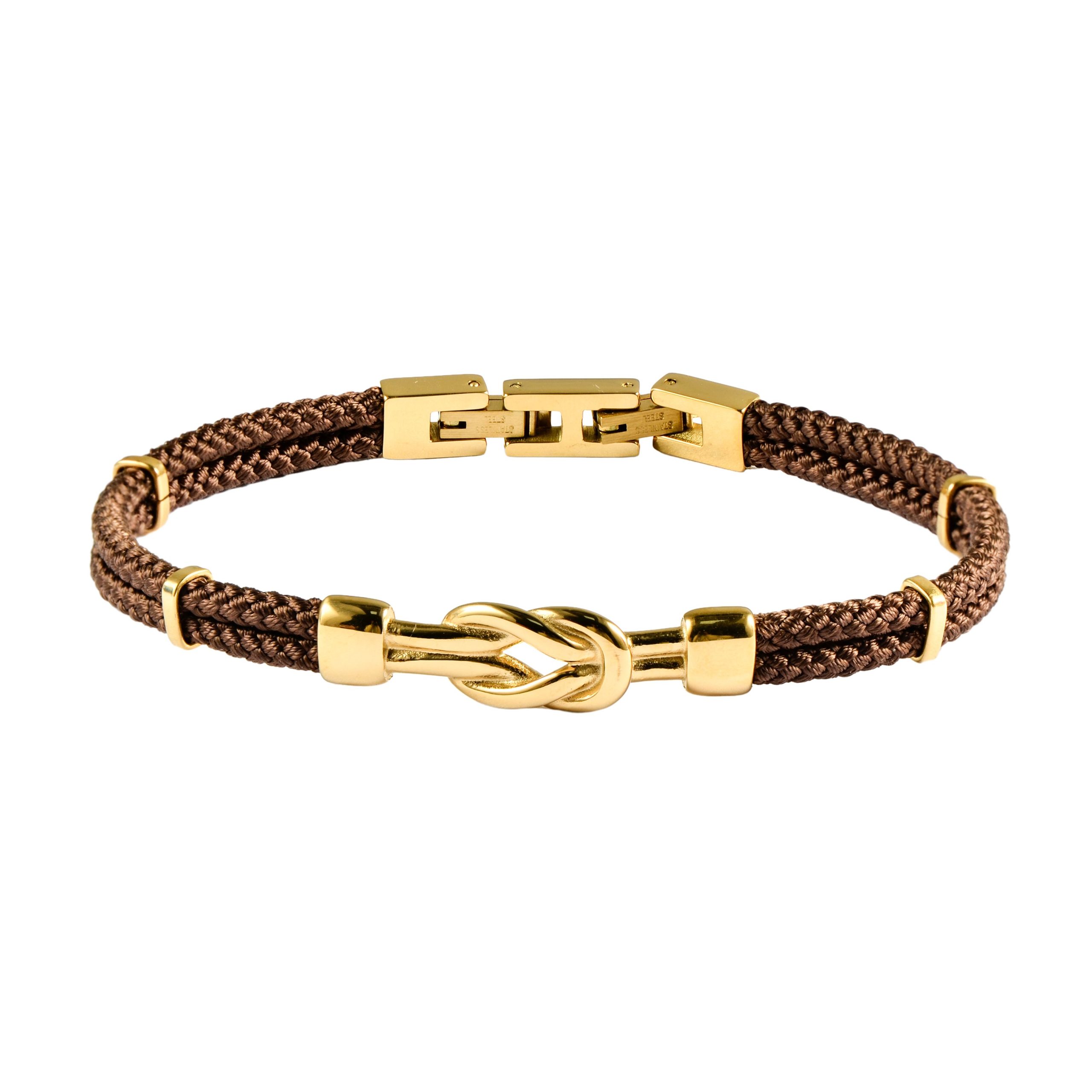 Double BROWN Nylon, Steel Guiders around Nylon, Golden Loop Knot as Central Feature, Width of Double Nylon : 6mm, Adjustable Press Release Clasp 21 cm
